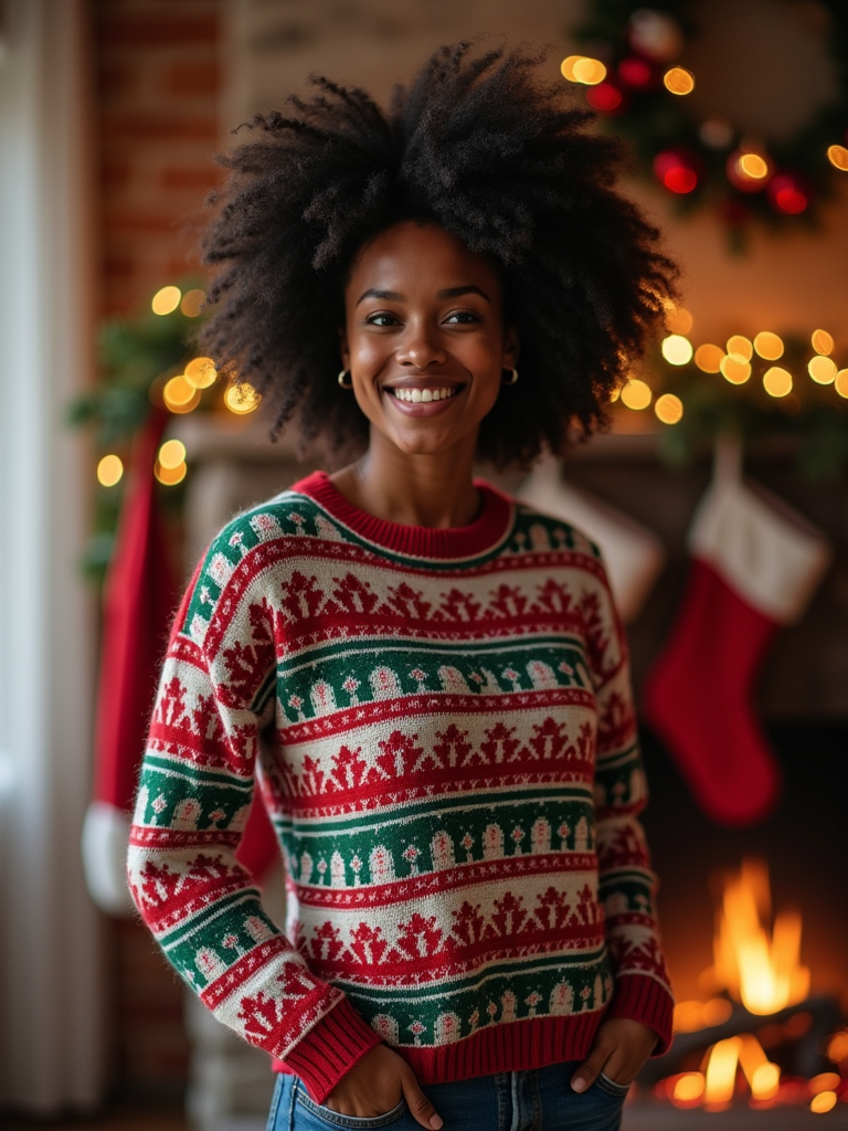 A model wearing a cozy Christmas sweater, standing by the fireplace with stockings and holiday decorations.