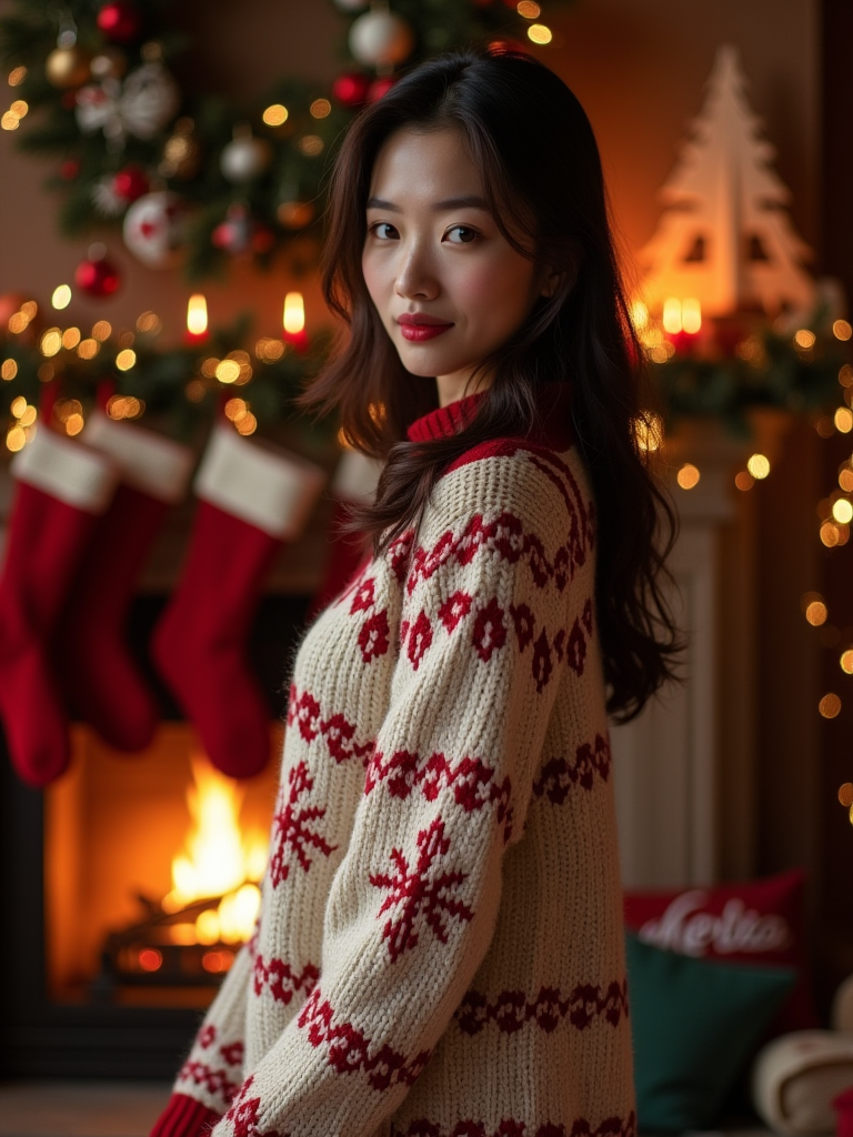 a model wearing a cozy christmas sweater, standing by the fireplace with stockings and holiday decorations.