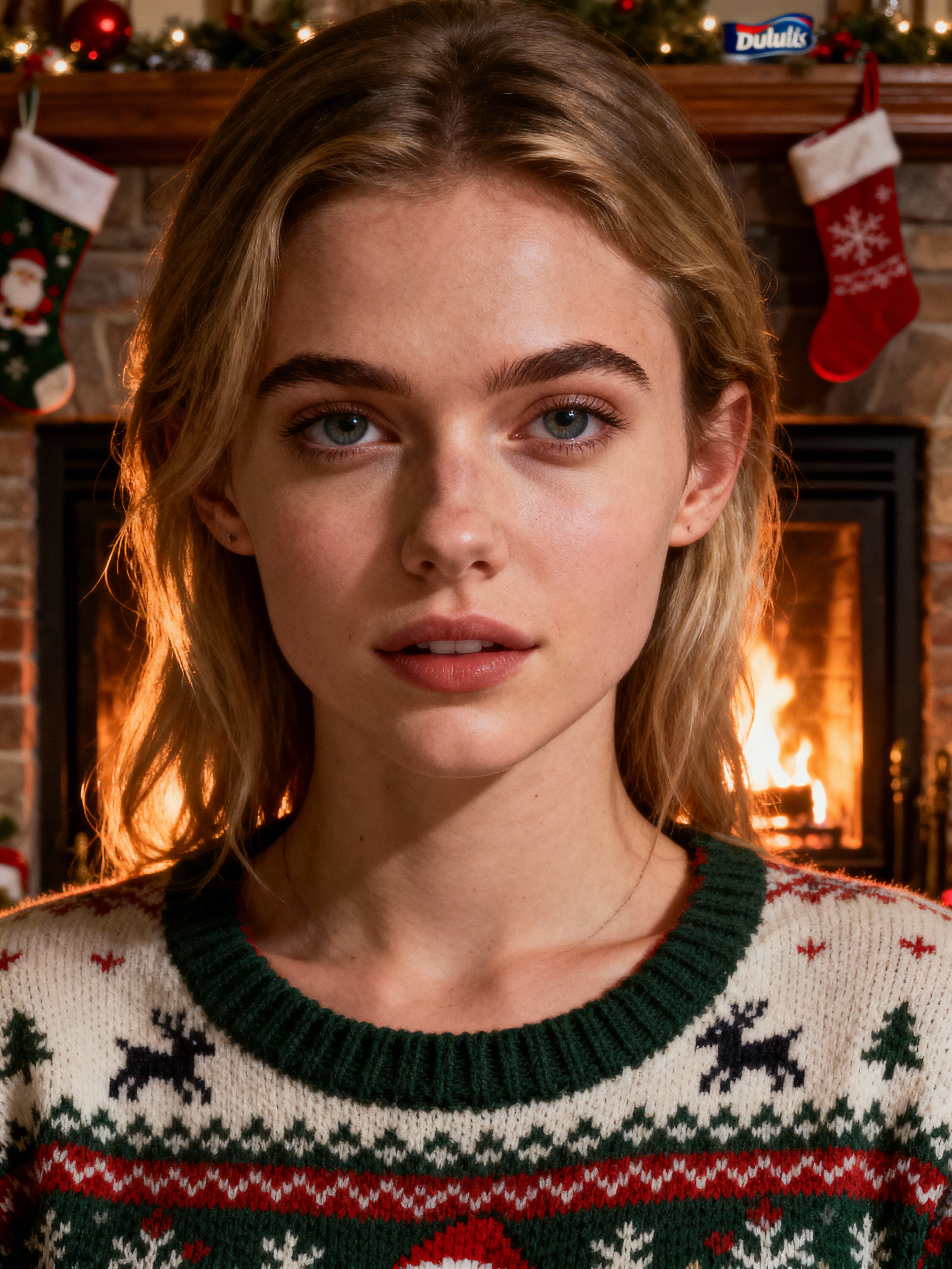 A model wearing a cozy Christmas sweater, standing by the fireplace with stockings and holiday decorations.