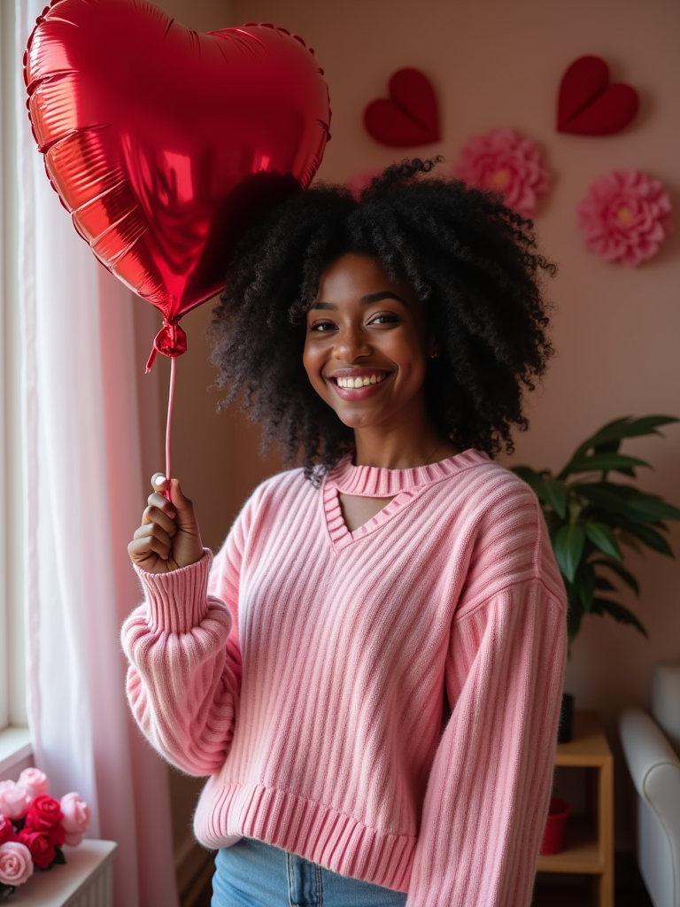 A model wearing a cute, pink Valentine's Day sweater, holding a heart-shaped balloon in a room filled with romantic decorations.