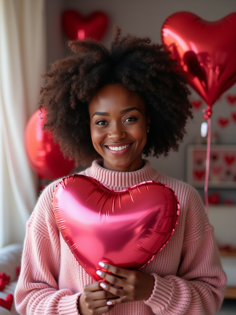 A model wearing a cute, pink Valentine's Day sweater, holding a heart-shaped balloon in a room filled with romantic decorations.