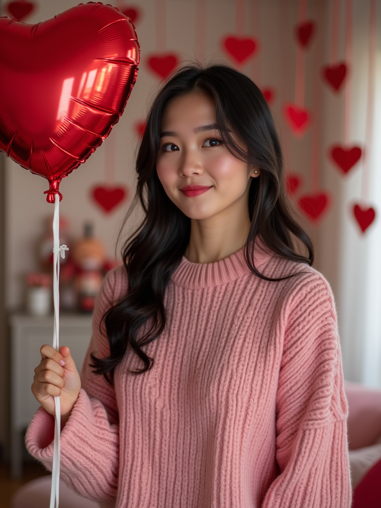 A model wearing a cute, pink Valentine's Day sweater, holding a heart-shaped balloon in a room filled with romantic decorations.