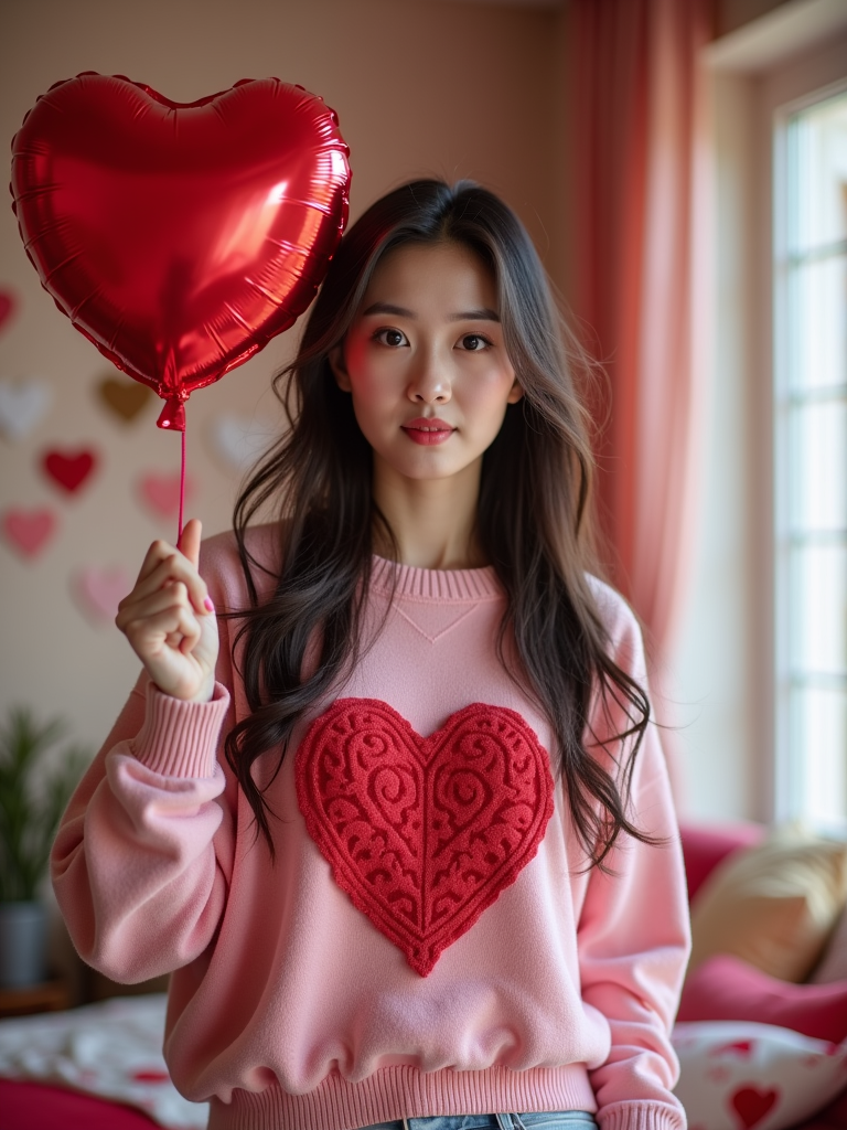 A model wearing a cute, pink Valentine's Day sweater, holding a heart-shaped balloon in a room filled with romantic decorations.