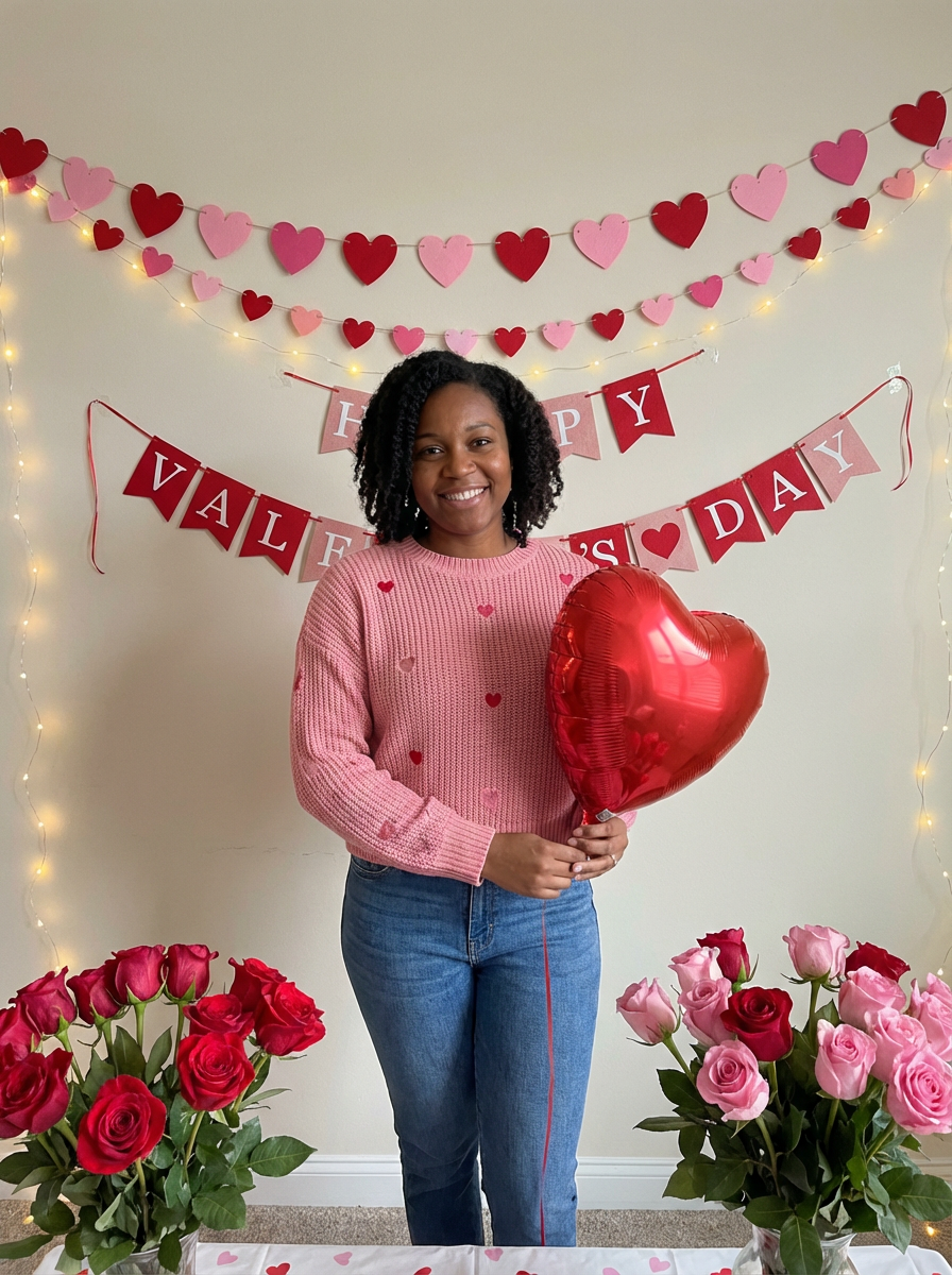 A model wearing a cute, pink Valentine's Day sweater, holding a heart-shaped balloon in a room filled with romantic decorations.