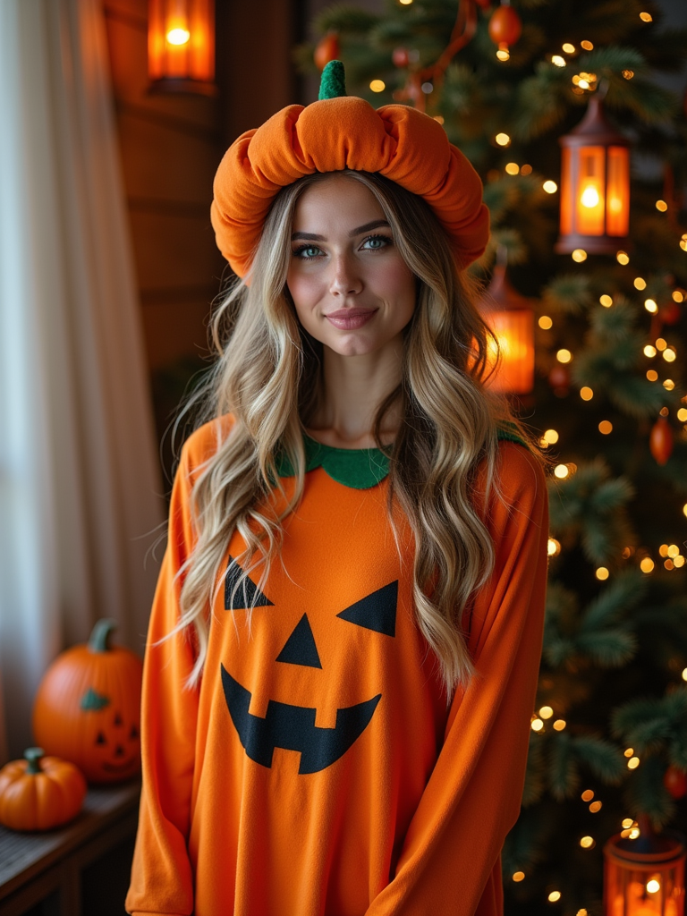 A model wearing a pumpkin-themed costume, standing beside a decorated Halloween tree and festive lanterns.
