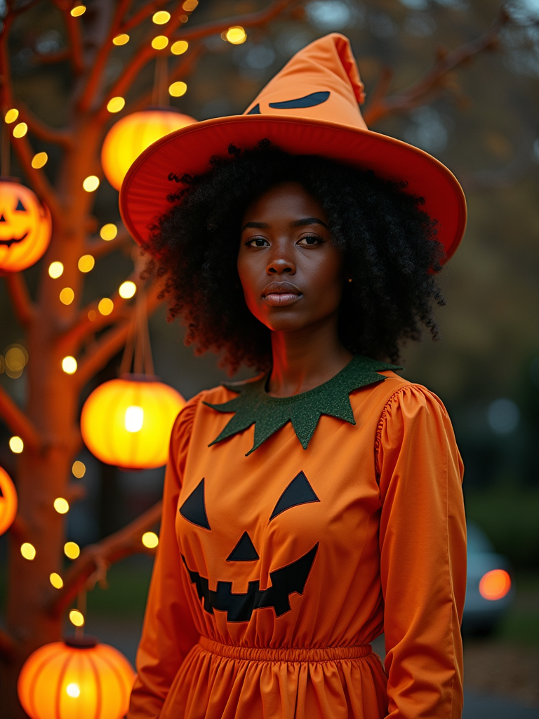 A model wearing a pumpkin-themed costume, standing beside a decorated Halloween tree and festive lanterns.