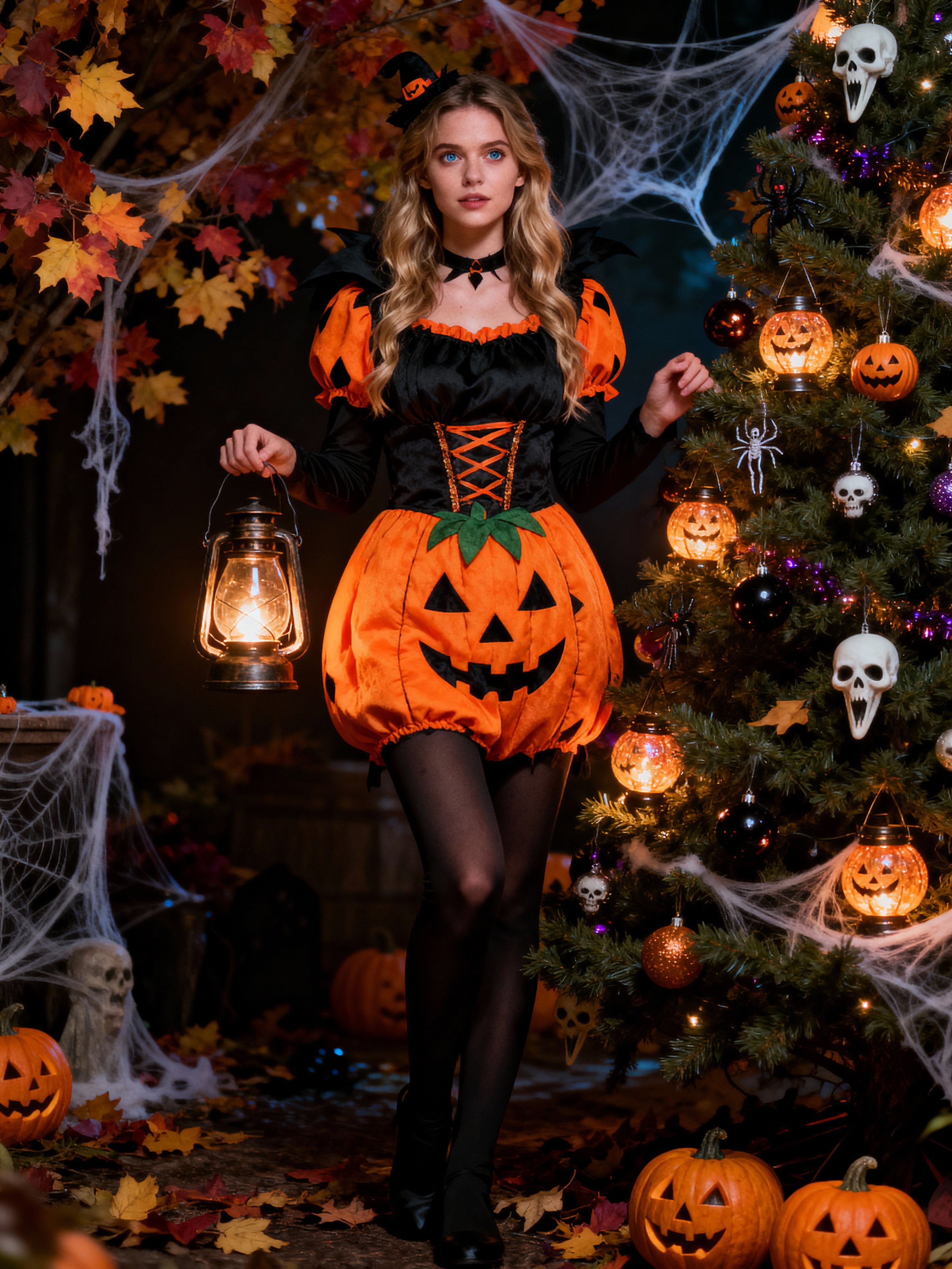 A model wearing a pumpkin-themed costume, standing beside a decorated Halloween tree and festive lanterns.