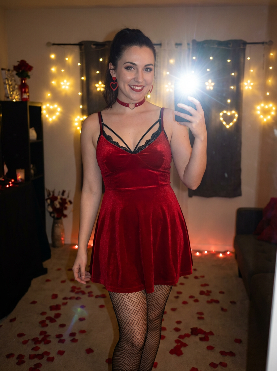 a model wearing a sexy Valentine\'s costume, (velvet red dress), stockings, heart-shaped accessories, lingerie, fishnets, rose petals, Valentine's lights, (camera flash light)