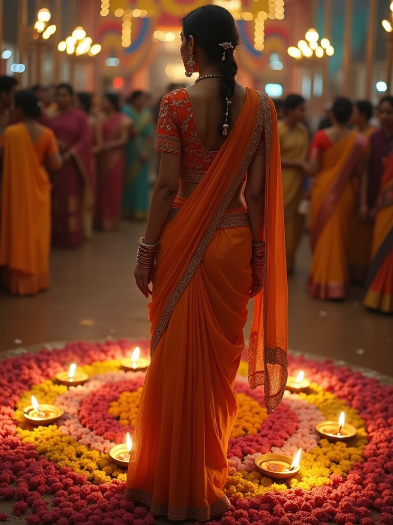 A model wearing a traditional Indian outfit like a sari or kurta, standing beside a rangoli made of colorful flowers and lit diyas, with a festive backdrop.