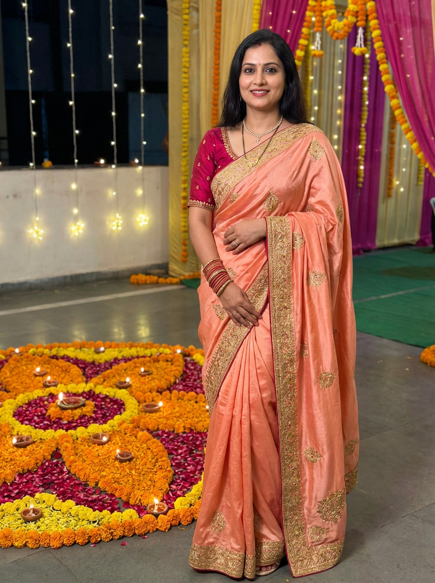 A model wearing a traditional Indian outfit like a sari or kurta, standing beside a rangoli made of colorful flowers and lit diyas, with a festive backdrop.