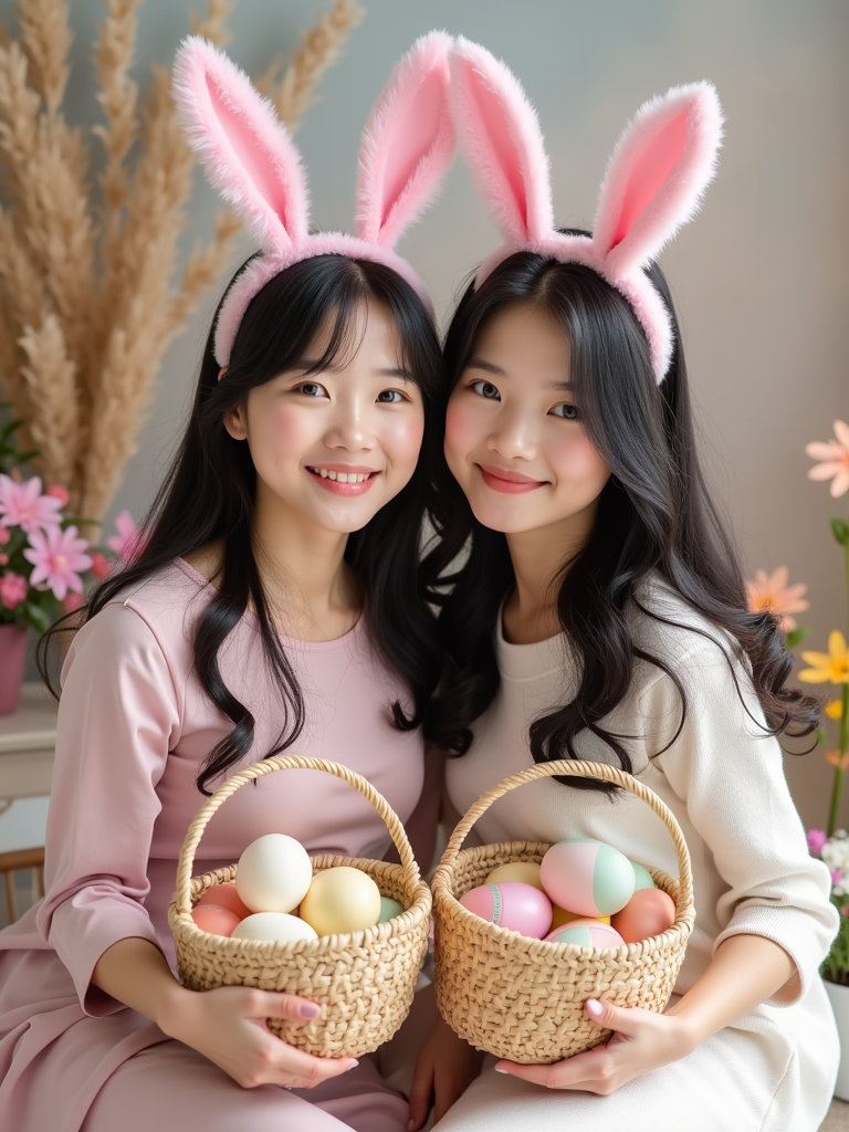 A model wearing bunny ears and posing together with their Easter baskets in front of a festive backdrop filled with spring flowers and pastel decorations.