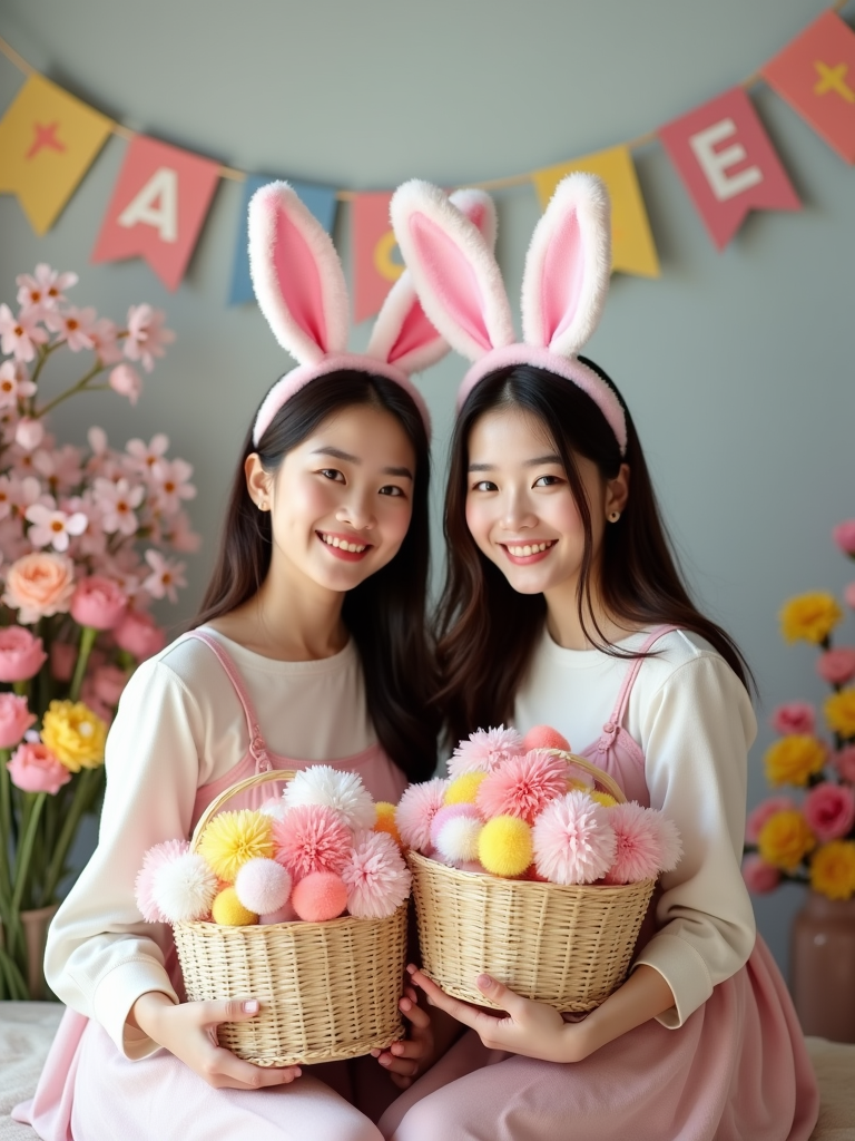 A model wearing bunny ears and posing together with their Easter baskets in front of a festive backdrop filled with spring flowers and pastel decorations.