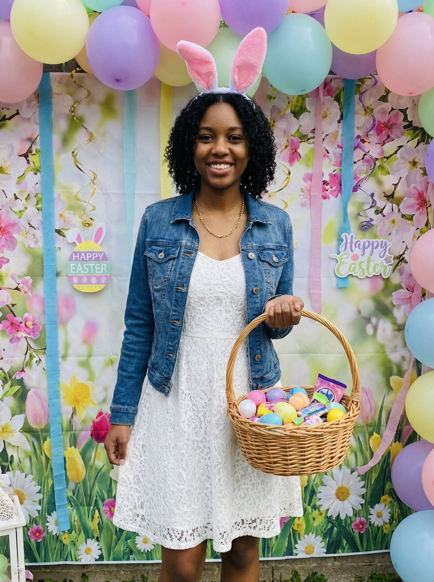 A model wearing bunny ears and posing together with their Easter baskets in front of a festive backdrop filled with spring flowers and pastel decorations.