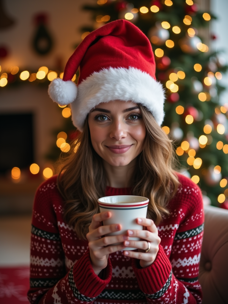 A model wearing Christmas sweaters and Santa hats, enjoying hot cocoa in front of a decorated Christmas tree.