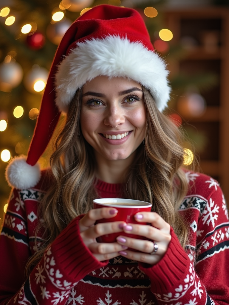 A model wearing Christmas sweaters and Santa hats, enjoying hot cocoa in front of a decorated Christmas tree.