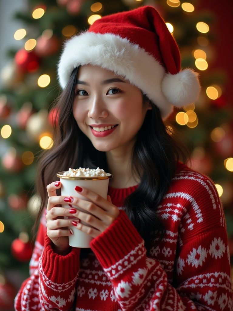 a model wearing christmas sweaters and santa hats, enjoying hot cocoa in front of a decorated christmas tree.