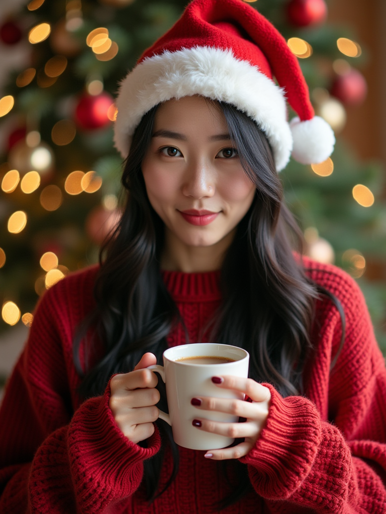 a model wearing christmas sweaters and santa hats, enjoying hot cocoa in front of a decorated christmas tree.