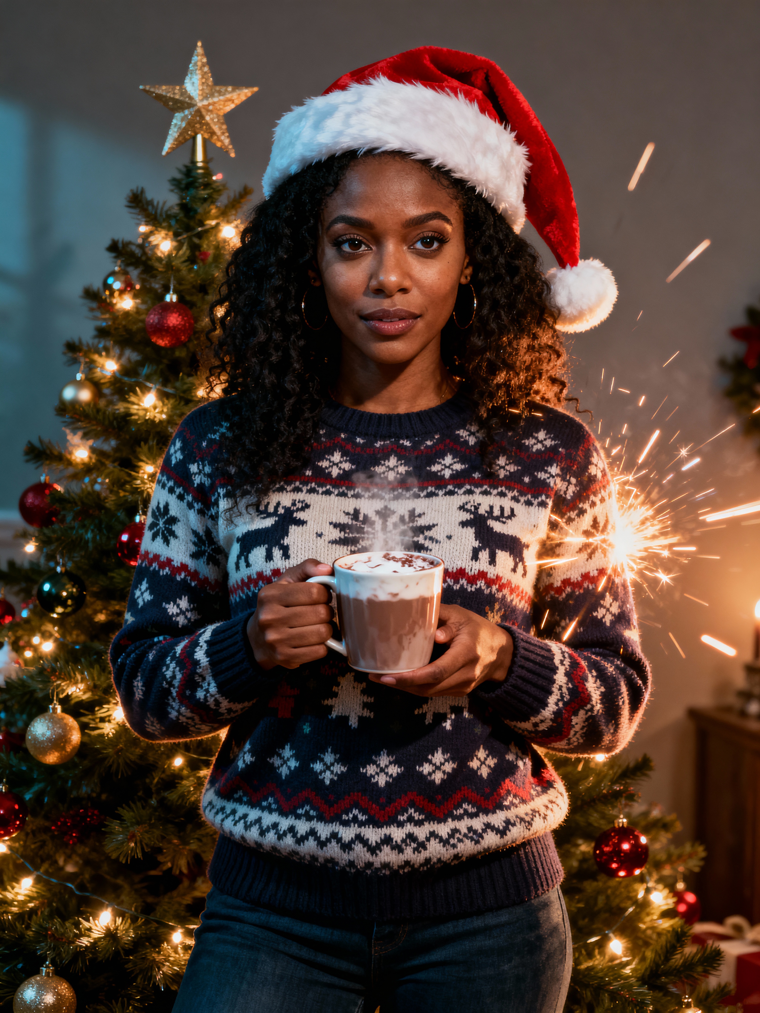 A model wearing Christmas sweaters and Santa hats, enjoying hot cocoa in front of a decorated Christmas tree.