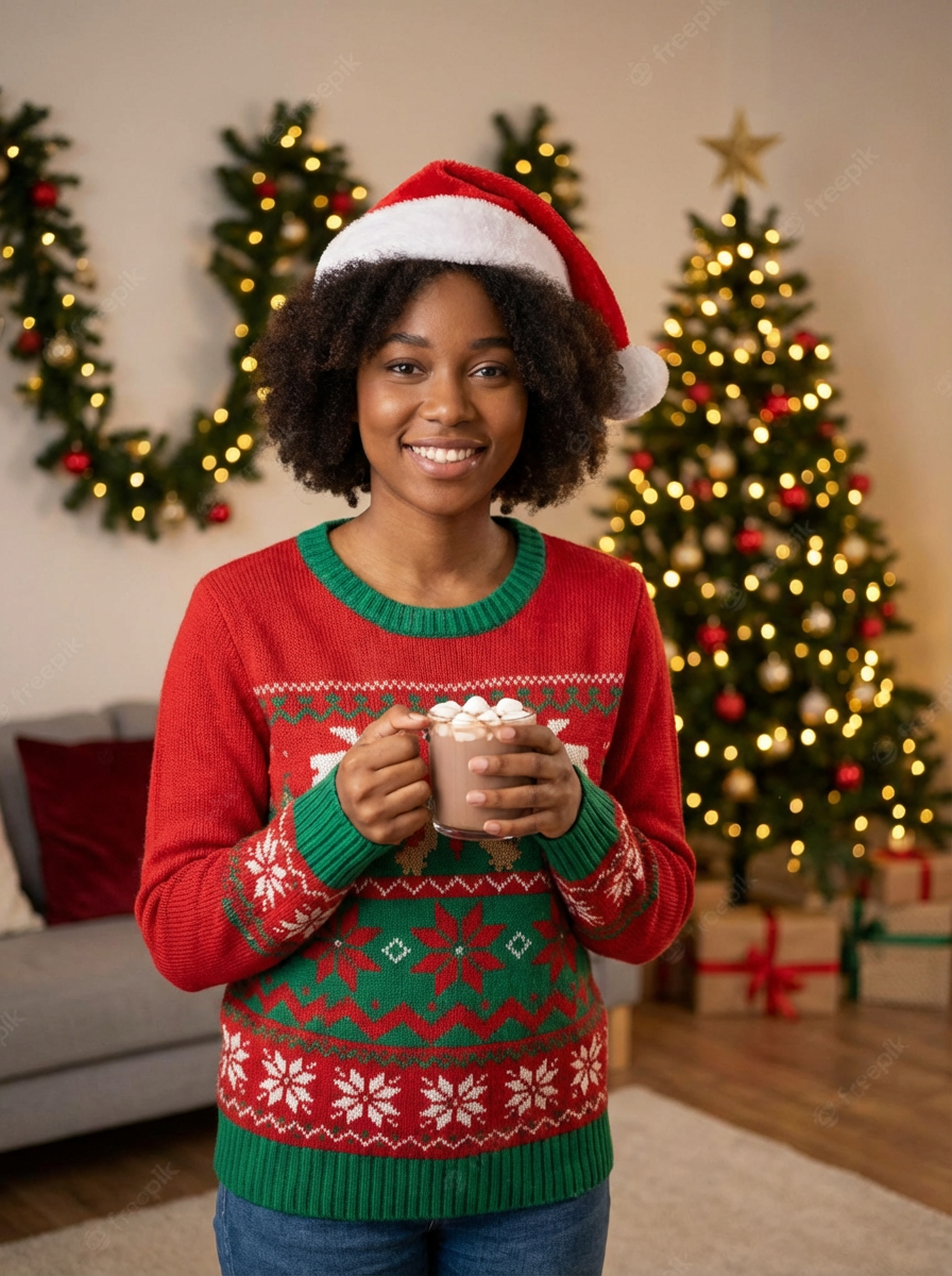 A model wearing Christmas sweaters and Santa hats, enjoying hot cocoa in front of a decorated Christmas tree.