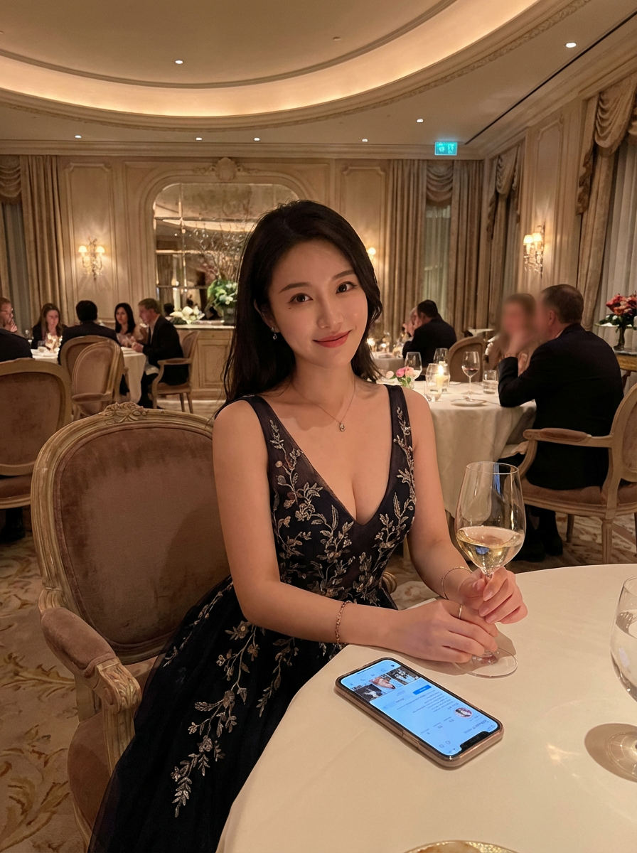 a model wearing luxurious dress in luxury restaurant, instagram photo, instagram, hourglass figure