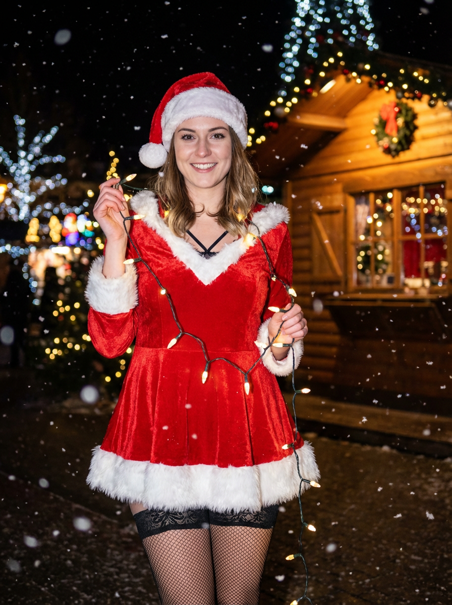 a model wearing sexy Christmas costume, (velvet red dress), stockings, Santa hat, lingerie, fishnets, snowflakes, Christmas lights, (camera flash light)
