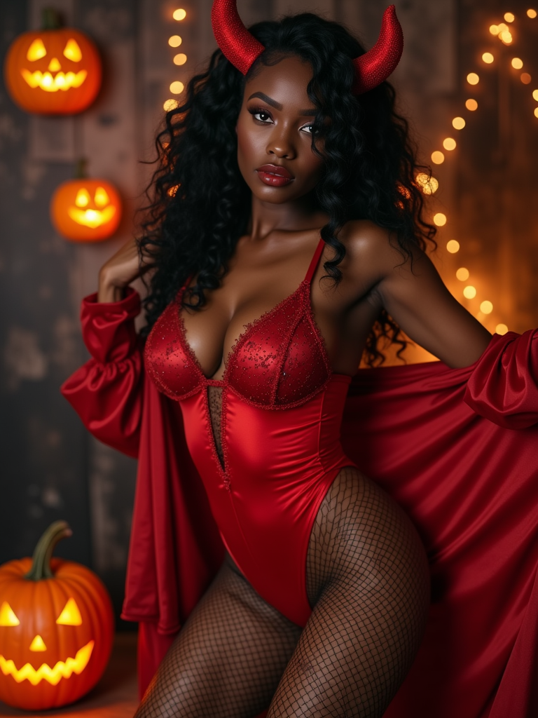 a model wearing sexy halloween costume, (silk red bodysuit), stockings, red devil, red devil horns, lingerie, fishnets, spiderwebs, pumpkins, (camera flash light)
