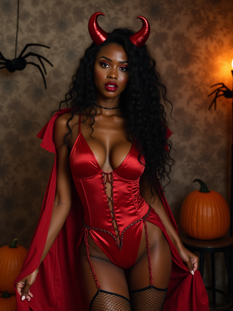 a model wearing sexy halloween costume, (silk red bodysuit), stockings, red devil, red devil horns, lingerie, fishnets, spiderwebs, pumpkins, (camera flash light)