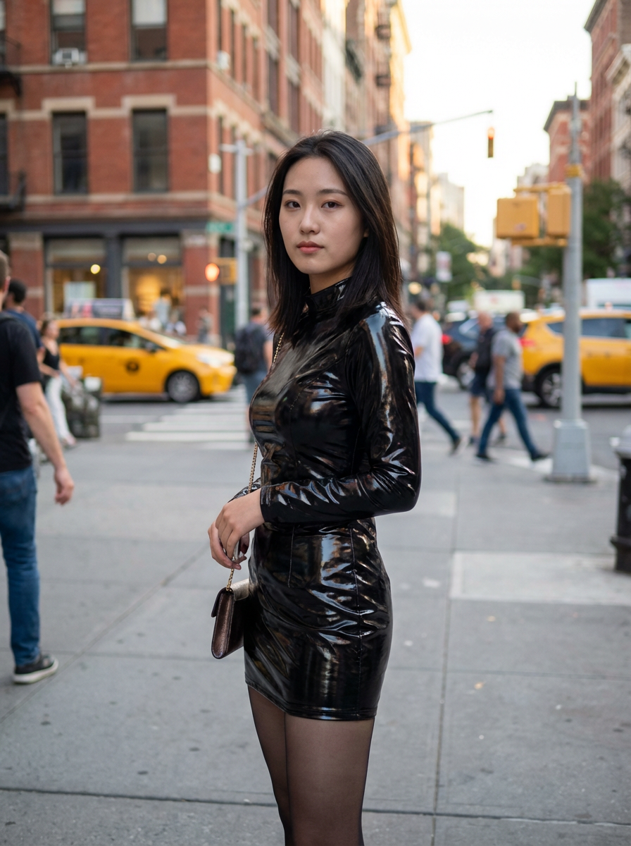 a model wearing sexy (pvc latex glossy reflective mini dress) standing in street