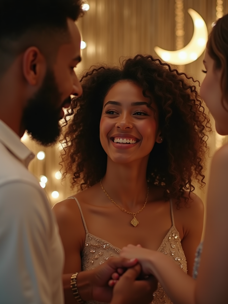a model with a happy expression while exchanging Eid greetings in a beautifully decorated space , adding a festive quality to their Eid celebration, with soft golden lights and crescent moon decorations visible in the background
