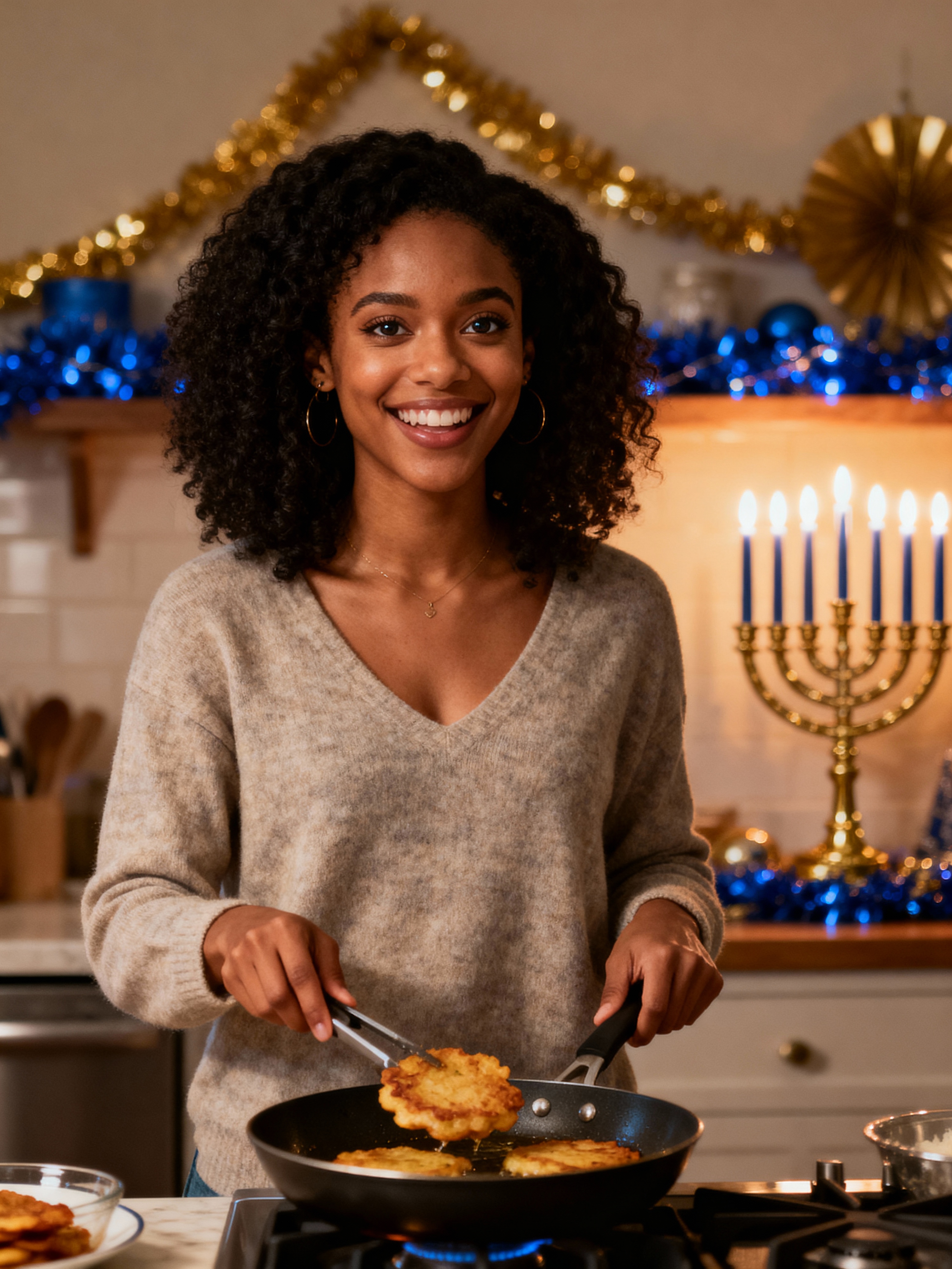 a model with a happy expression while frying latkes in a warm kitchen , adding a festive quality to their celebration, with menorah lights and blue and gold decorations visible in the background