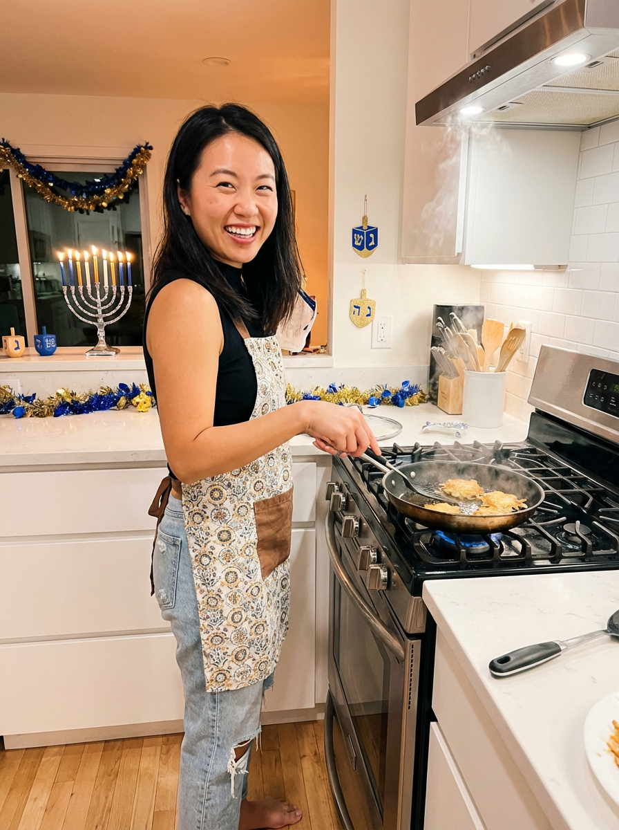 a model with a happy expression while frying latkes in a warm kitchen , adding a festive quality to their celebration, with menorah lights and blue and gold decorations visible in the background
