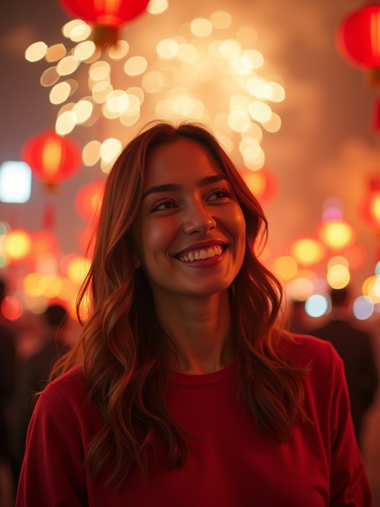 a model with a happy expression while participating in Chinese New Year traditions , adding a festive quality to their celebration, with fireworks and lanterns visible in the background