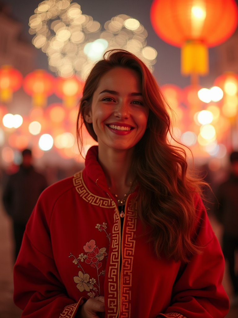 a model with a happy expression while participating in Chinese New Year traditions , adding a festive quality to their celebration, with fireworks and lanterns visible in the background