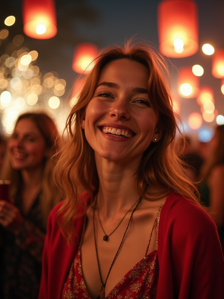a model with a happy expression while participating in New Year traditions , adding a festive quality to their celebration, with fireworks and lanterns visible in the background