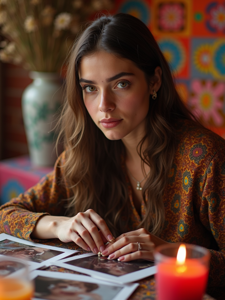 a model with a serene expression while placing photos on an altar , adding a meaningful quality to their celebration, with sugar skulls and papel picado visible in the background