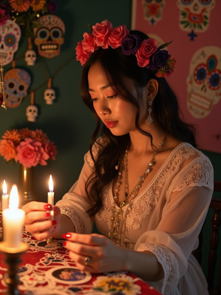 a model with a serene expression while placing photos on an altar , adding a meaningful quality to their celebration, with sugar skulls and papel picado visible in the background