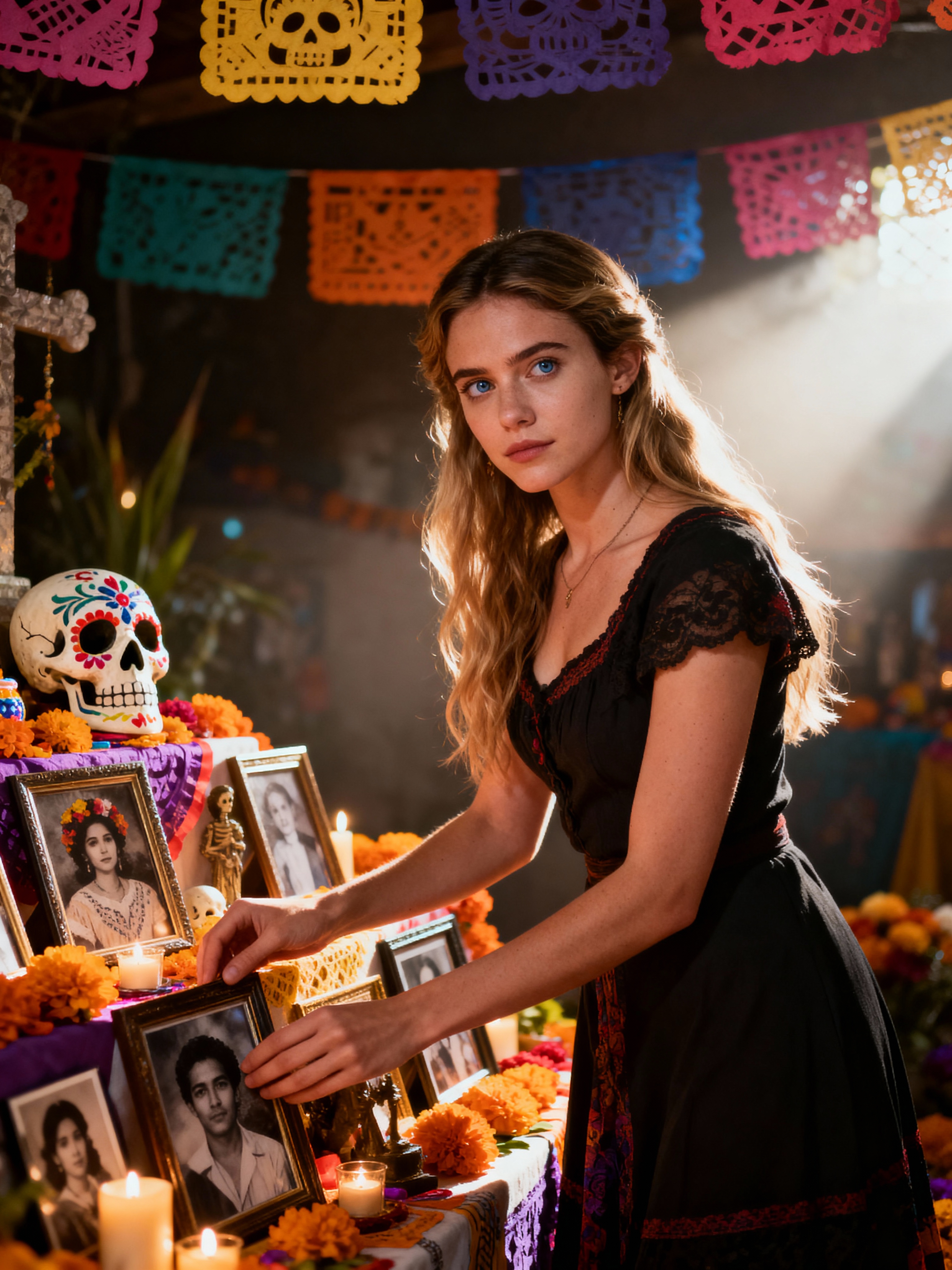 a model with a serene expression while placing photos on an altar , adding a meaningful quality to their celebration, with sugar skulls and papel picado visible in the background