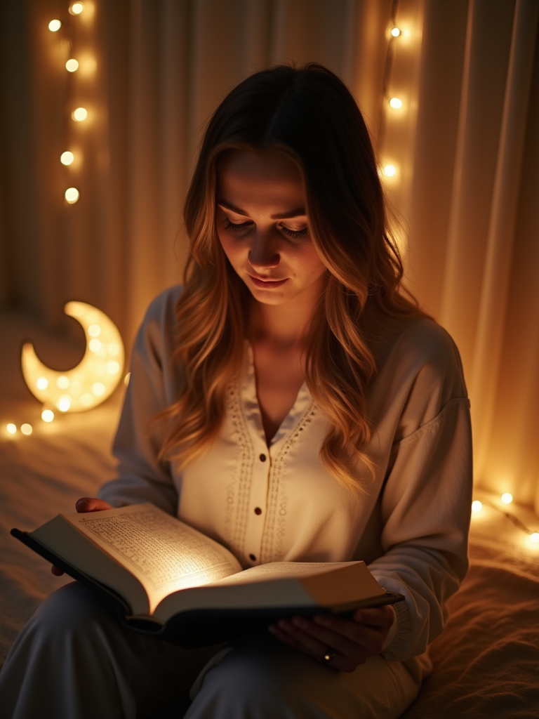 a model with a serene expression while reading Quran in a beautifully decorated space , adding a spiritual quality to their Ramadan observance, with soft golden lights and crescent moon decorations visible in the background