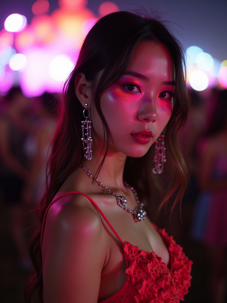a model with colorful festival makeup , standing out in the Coachella crowd at night with stage lights illuminating the scene