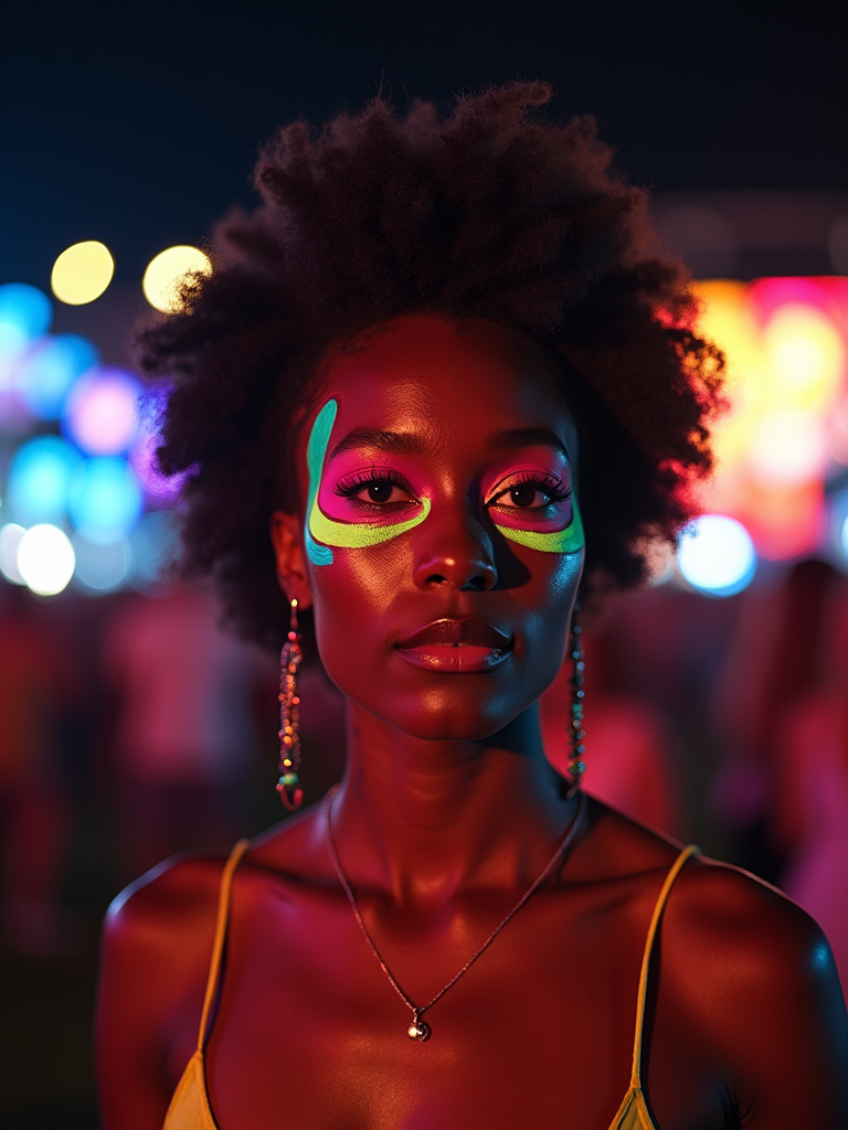 a model with colorful festival makeup , standing out in the Coachella crowd at night with stage lights illuminating the scene