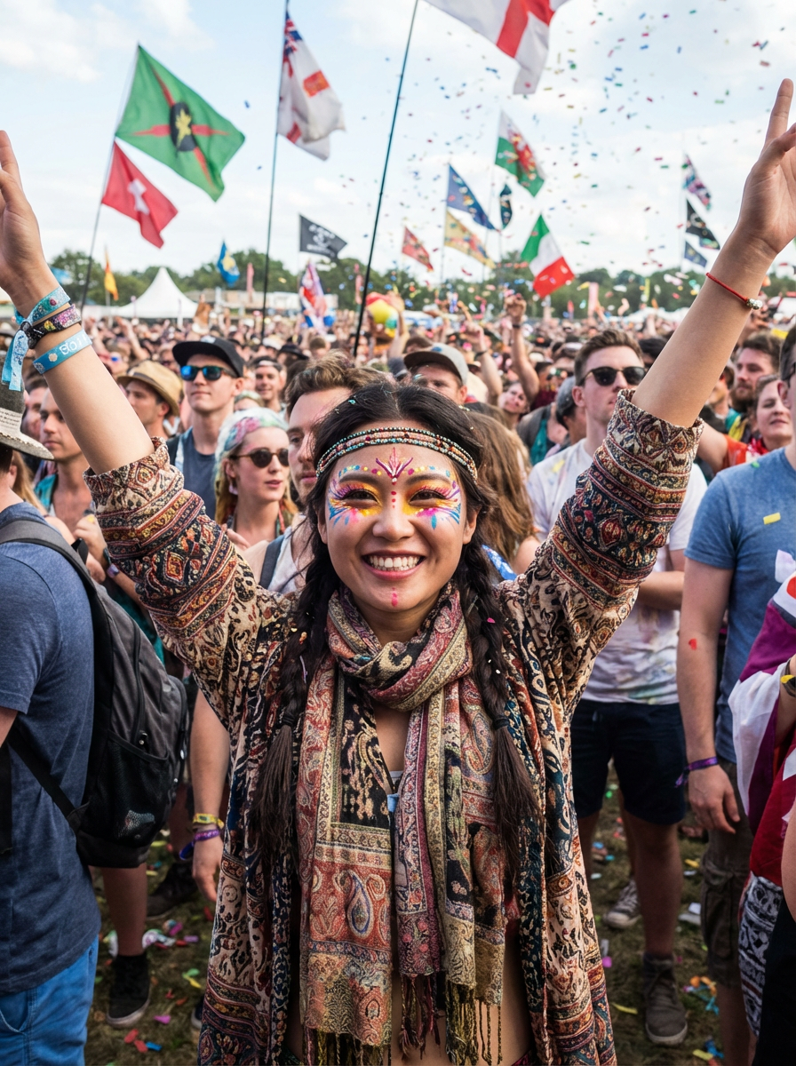 a model with colorful festival makeup , standing out in the crowd and embracing the festival's vibrant atmosphere