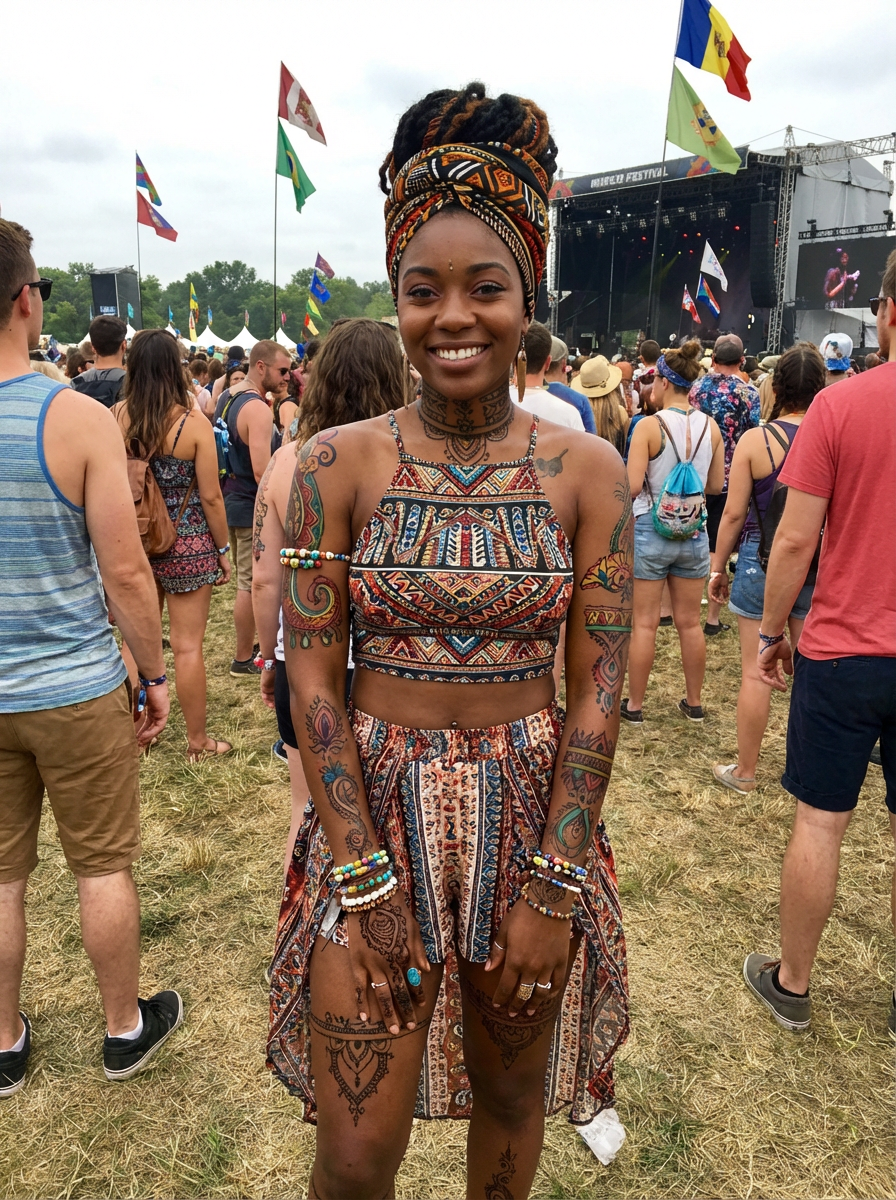 a model with colorful temporary tattoos and henna art , adding an element of tribal and cultural inspiration to their festival look