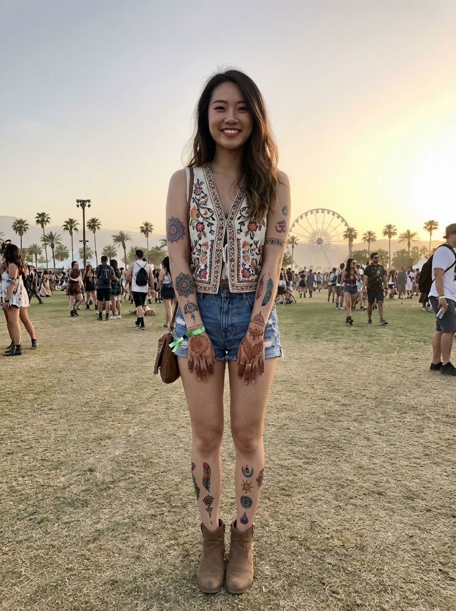 a model with colorful temporary tattoos and henna art , adding bohemian flair to their Coachella look, with the iconic festival grounds visible in the background