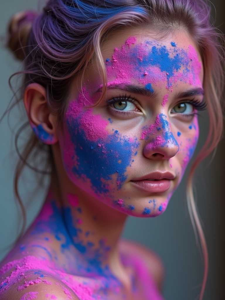 a model with face artistically covered in blue and pink Holi powders , capturing the artistic expression that defines this ancient celebration