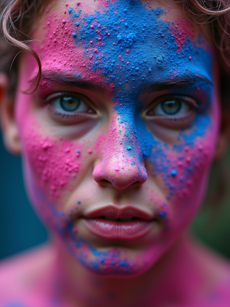 a model with face artistically covered in blue and pink Holi powders , capturing the artistic expression that defines this ancient celebration