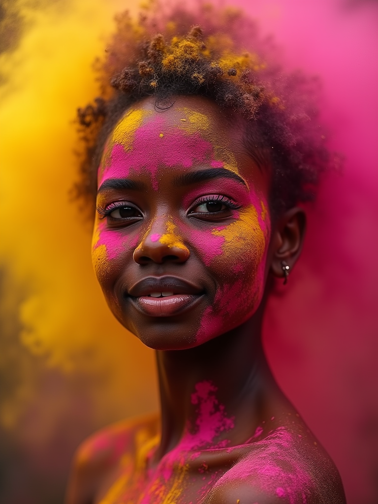 a model with face beautifully decorated with yellow and pink Holi colors , adding a magical quality to their festival look, with colored powder explosions visible in the background
