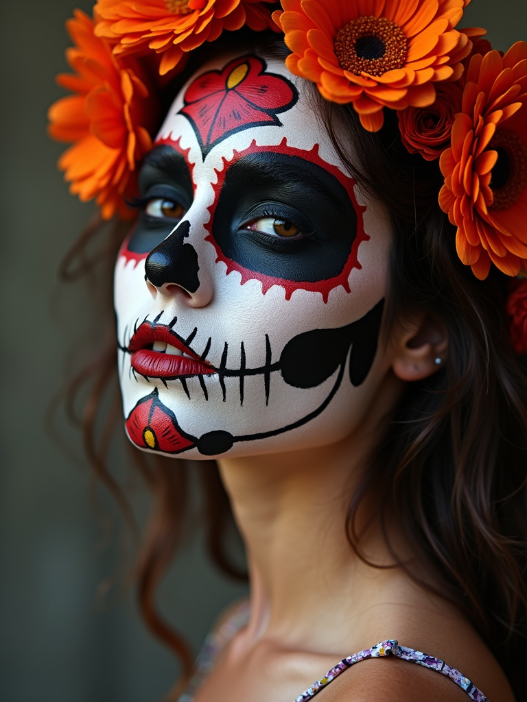 a model with face beautifully painted in half-skull calavera style , capturing the duality of life and death that defines this important cultural celebration