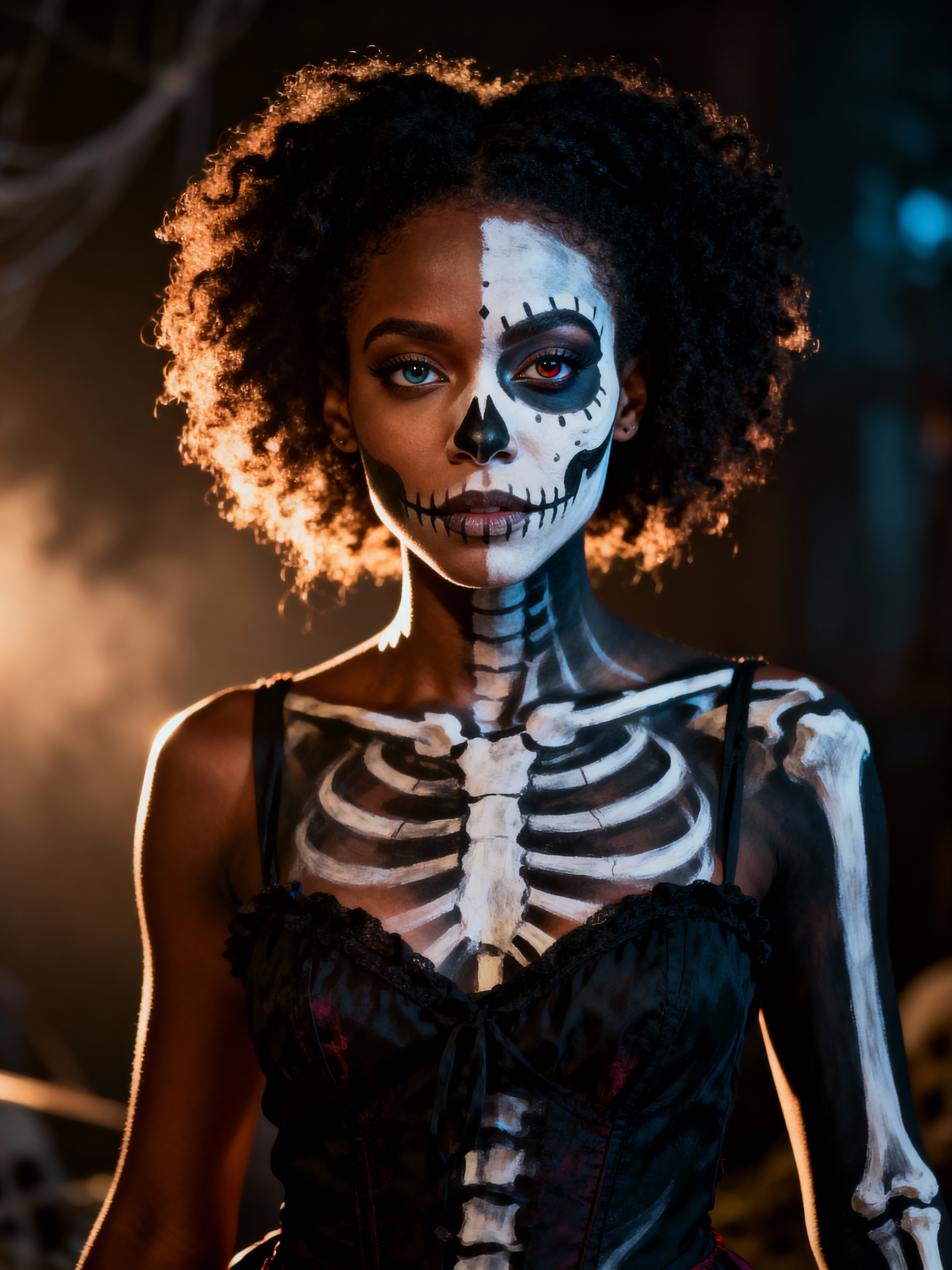 a model with face beautifully painted in half-skull calavera style , capturing the duality of life and death that defines this important cultural celebration