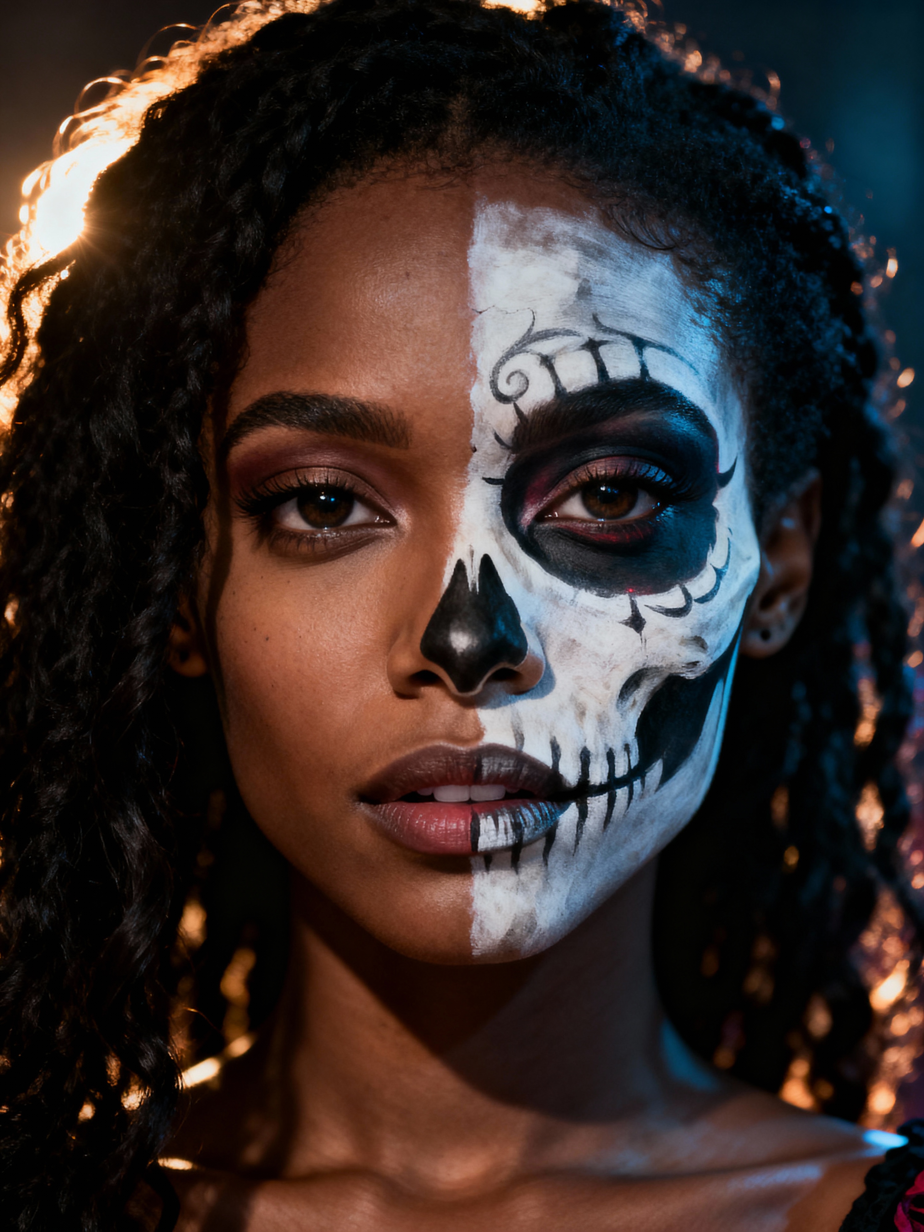 a model with face beautifully painted in half-skull calavera style , capturing the duality of life and death that defines this important cultural celebration