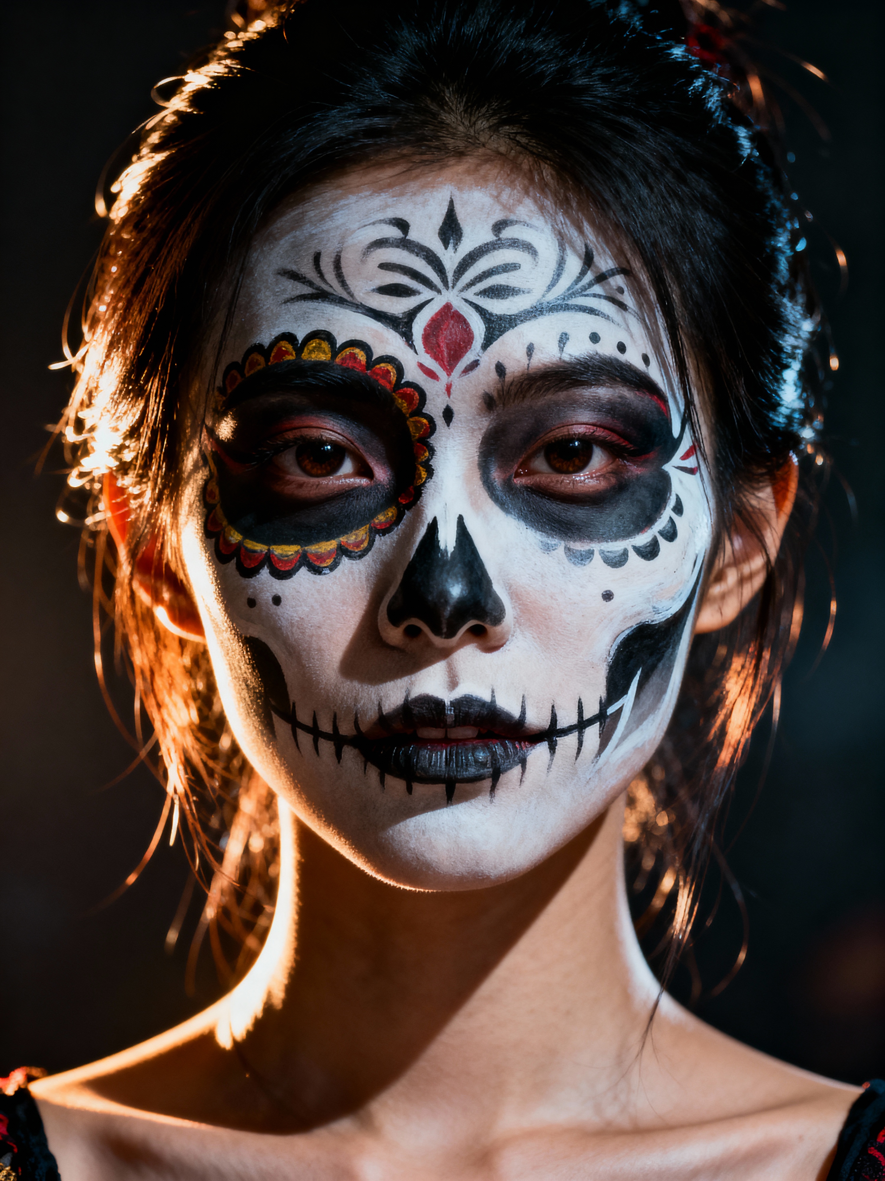 a model with face beautifully painted in half-skull calavera style , capturing the duality of life and death that defines this important cultural celebration